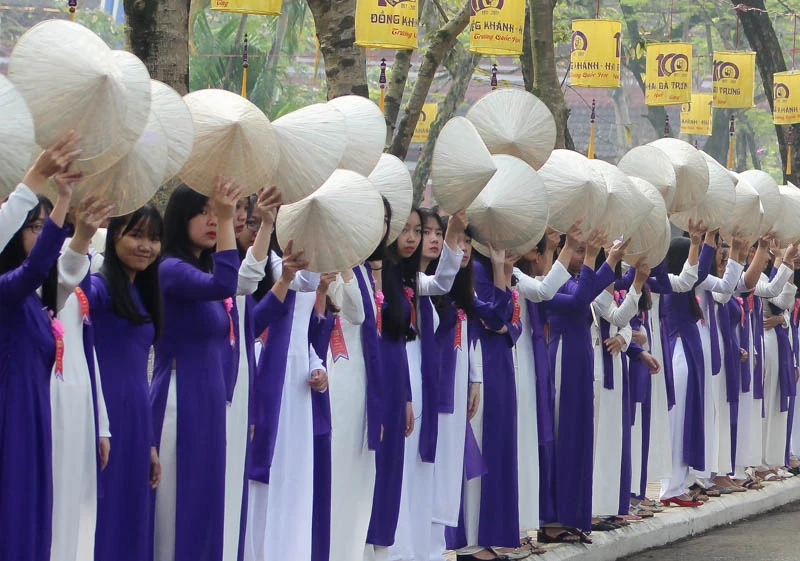 Nữ sinh Trường THPT Hai Bà Trưng mặc áo dài trong ngày kỷ niệm 100 năm thành lập trường. Ảnh: N.DO
