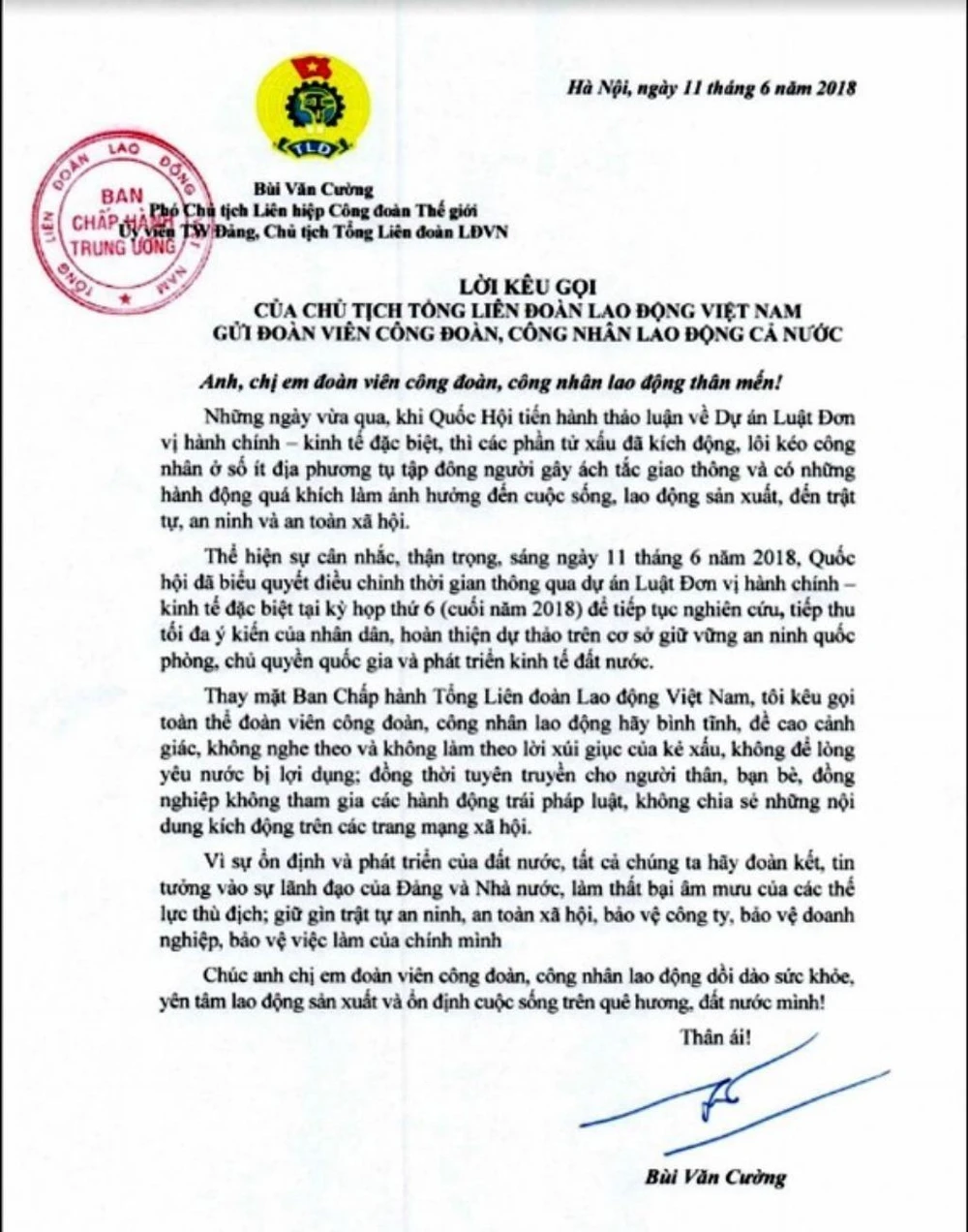 Ngay sau đó, ông Bùi Văn Cường, Phó Chủ tịch Liên hiệp Công đoàn Thế giới, Ủy viên Trung ương Đảng, Chủ tịch Tổng LĐLĐ VN, đã gửi lời kêu gọi đến anh chị em đoàn viên công đoàn, công nhân lao động cả nước bình tĩnh, đề cao cảnh giác, không để lòng yêu được bị lợi dụng.