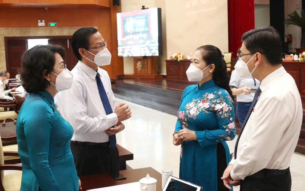 Chủ tịch UBND TP.HCM Phan Văn Mãi (thứ hai từ trái sang) trao đổi với Chủ tịch HĐND TP Nguyễn Thị Lệ và các đại biểu, sáng 18-10. Ảnh: TTBC