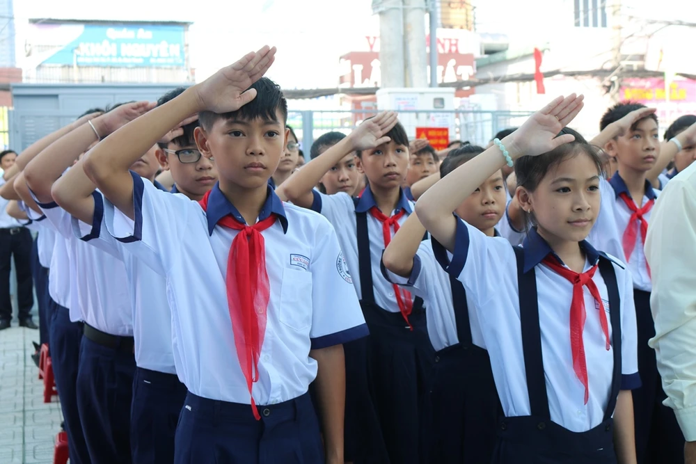 Học sinh Trường THCS Cửu Long, quận Bình Thạnh trong ngày lễ khai giảng năm học mới.
