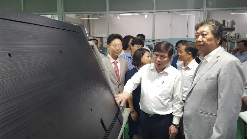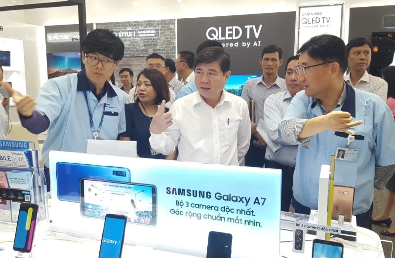Chủ tịch Nguyễn Thành Phong tham quan phòng trưng bày sản phẩm của Công ty Samsung. Ảnh: TÁ LÂM