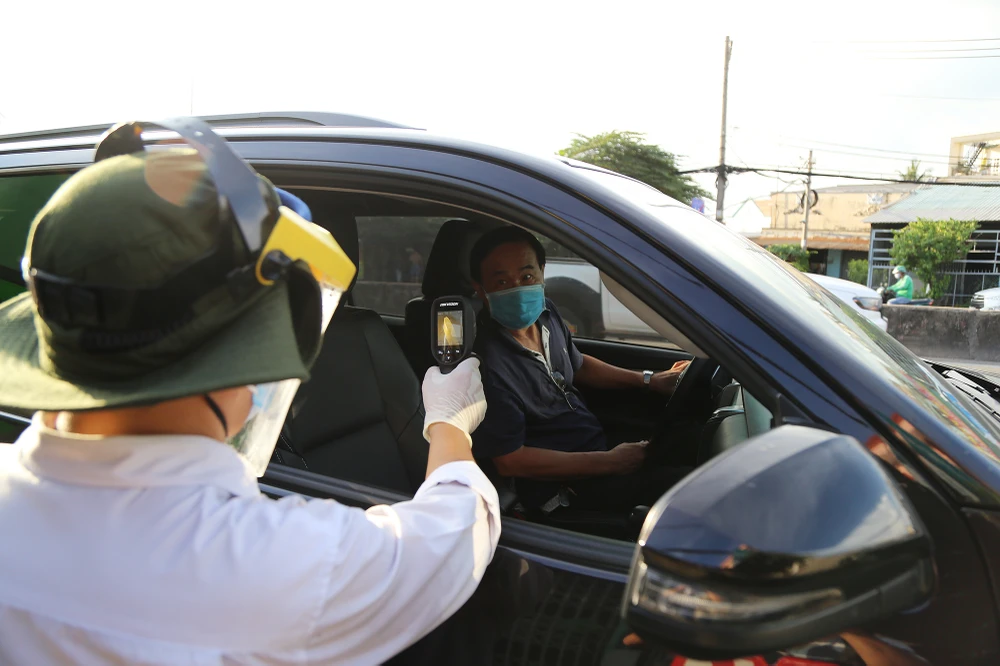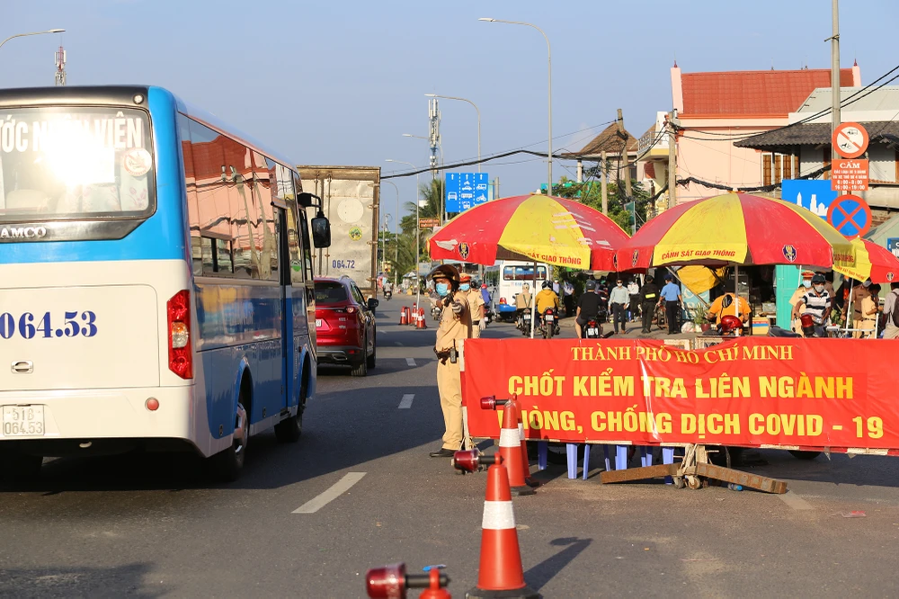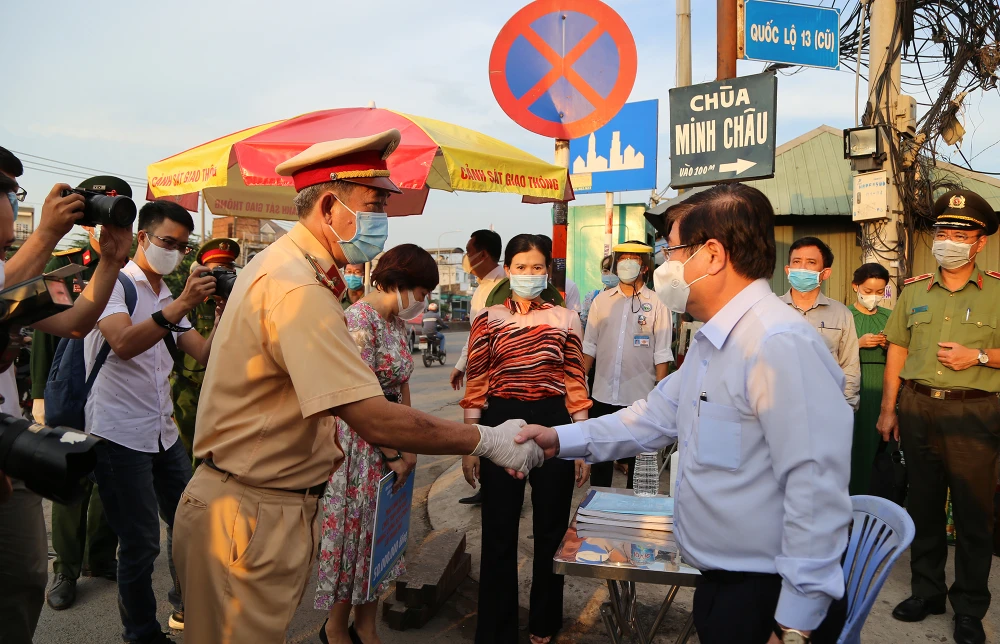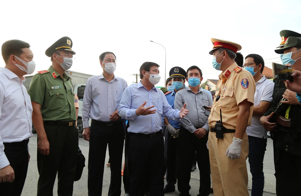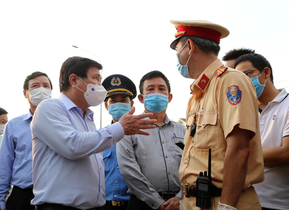 Chiều tối 20-5, đoàn kiểm tra do Chủ tịch UBND TP.HCM Nguyễn Thành Phong dẫn đầu đã đến thăm các chốt kiểm soát dịch COVID-19 ở cửa ngõ thành phố gồm các chốt ở chân cầu Vĩnh Bình, cầu vượt Sóng Thần và chốt trên Quốc lộ 1K.