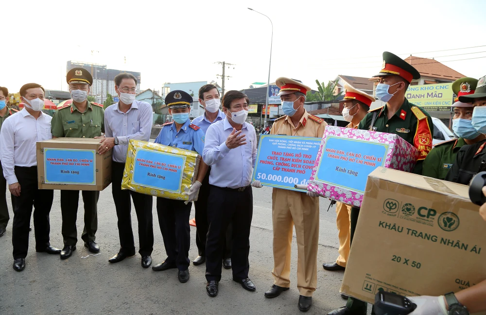 Cũng trong chuyến thăm, lãnh đạo TP.HCM đã trao tặng các phần quà để động viên tinh thần cán bộ, chiến sĩ và nhân viên y tế tại chốt.