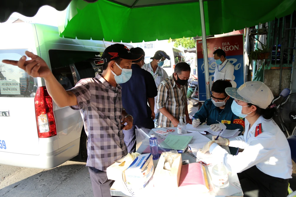 Các tài xế khi đi qua đây được mời vào khu vực khai thông tin bao gồm biển số xe, lộ trình di chuyển, số lượng khách trên xe và điểm đến tại TP.HCM.