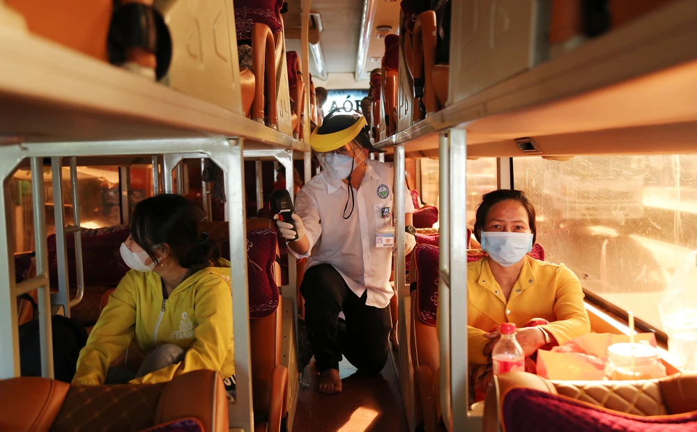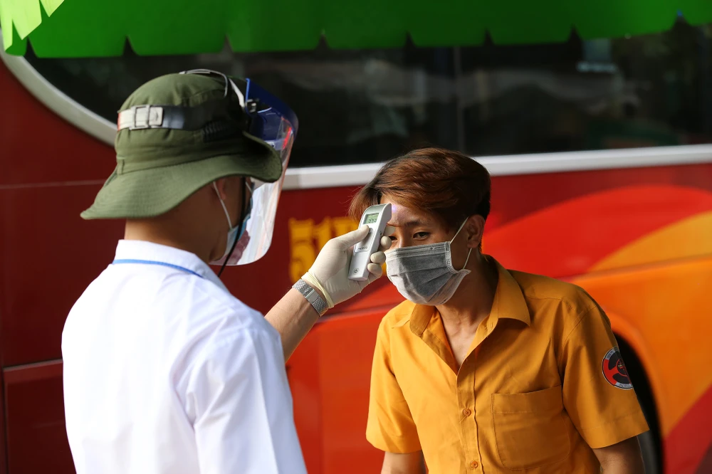 Nhân viên y tế kiểm tra thân nhiệt tài xế và tất cả hành khách.
