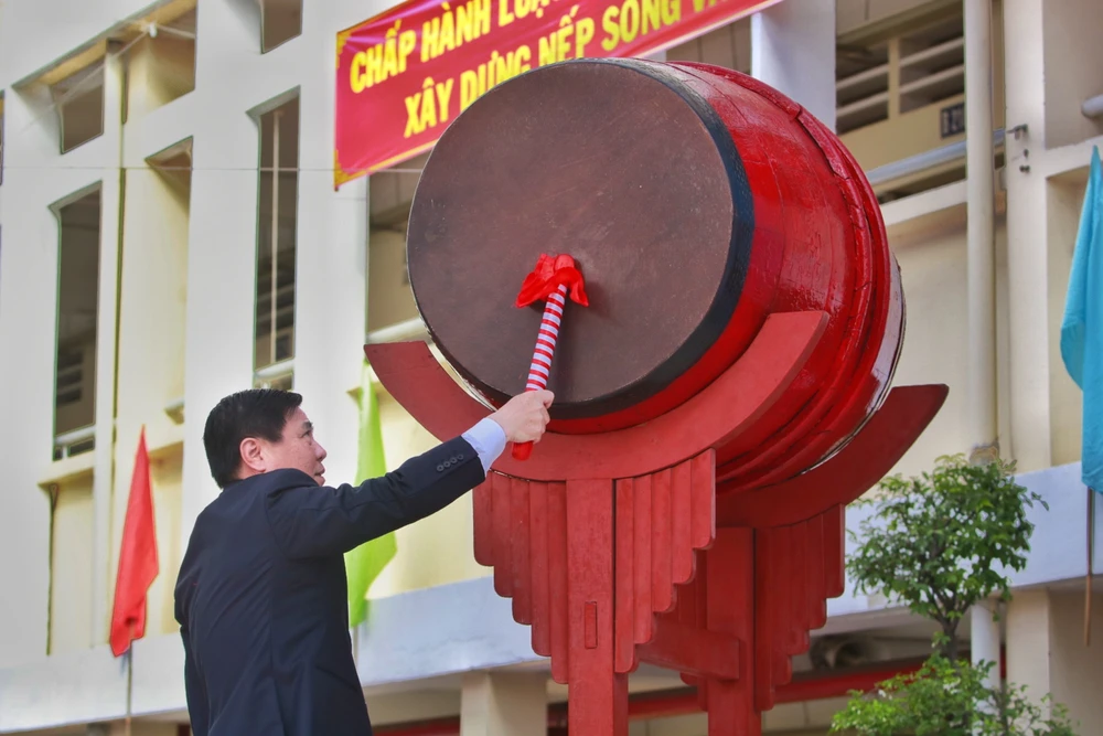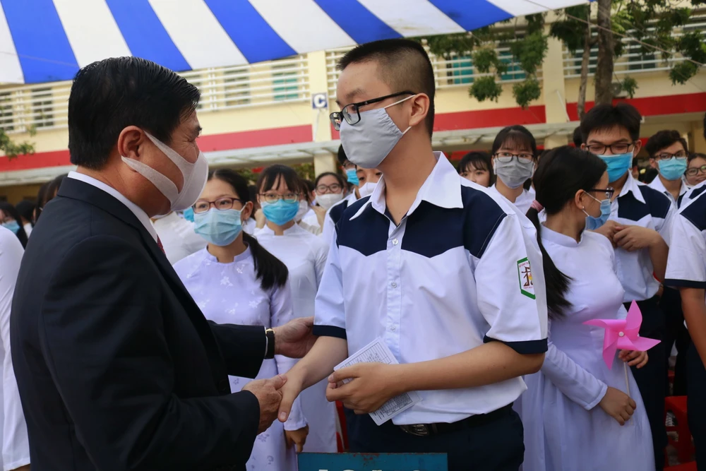 Ông Nguyễn Thành Phong (Chủ tịch UBND TP.HCM) đánh trống khai giảng năm học mới. Cuối buổi lễ, ông gửi chúc mừng đến toàn thể học sinh của nhà trường, động viên các em nỗ lực học tập.