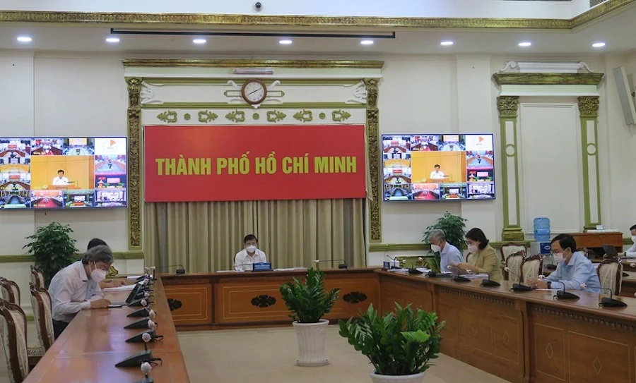 Chủ tịch UBND TP Nguyễn Thành Phong chủ trì ở điểm cầu UBND TP. Ảnh: Web Thành ủy TP.HCM