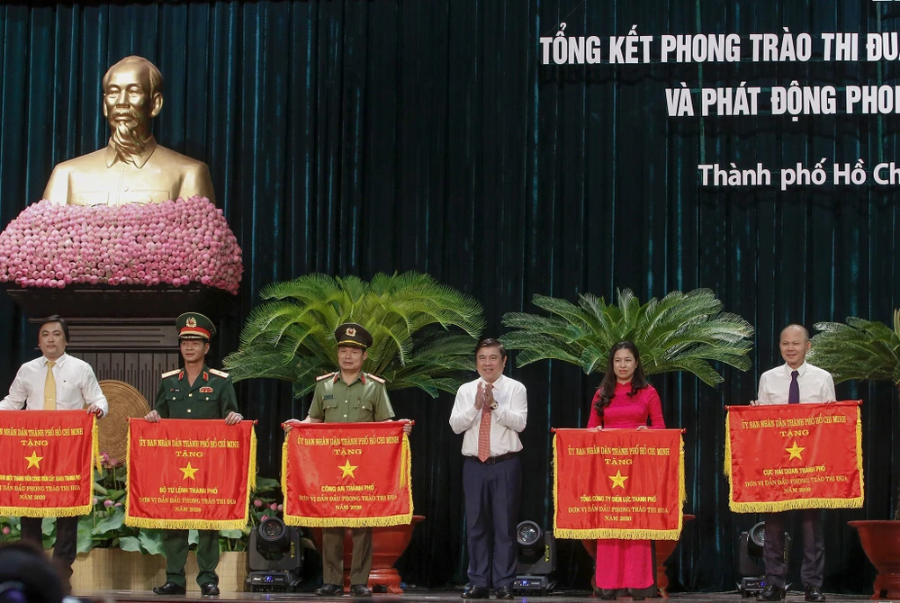 Ông Nguyễn Thành Phong, Chủ tịch UBND TP.HCM trao cờ thi đua cho các đơn vị. Ảnh: NGUYỆT NHI