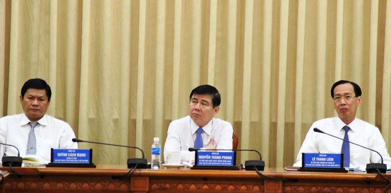 Chủ tịch Nguyễn Thành Phong (giữa) chỉ đạo tại cuộc họp. Ảnh: TÁ LÂM