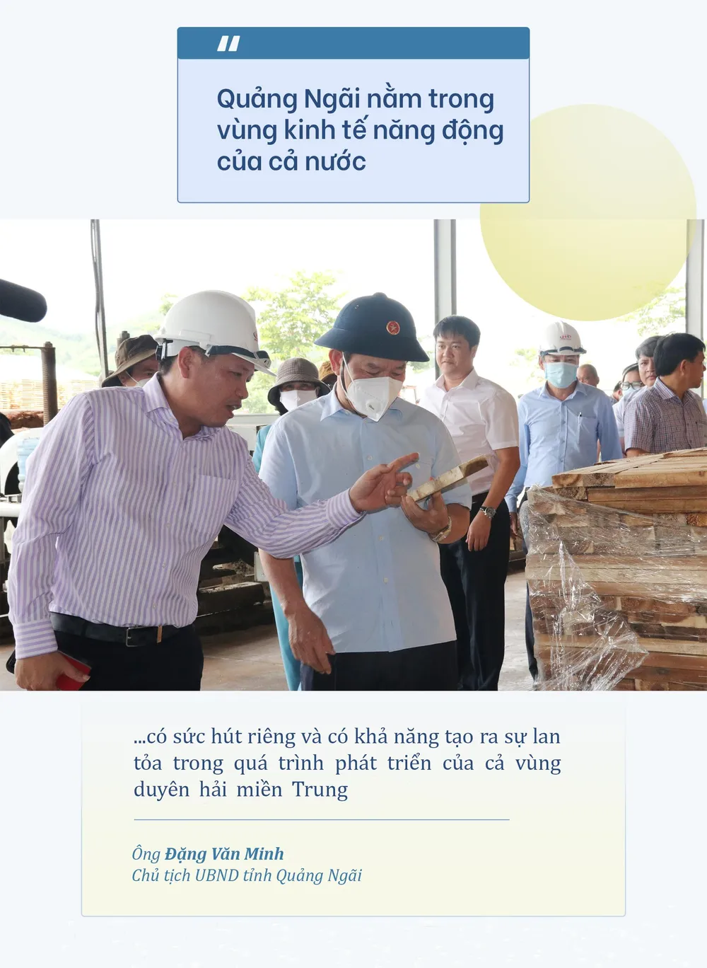 Bên cạnh đó, Quảng Ngãi còn có nhiều tiềm năng để phát triển công nghiệp, có Khu kinh tế Dung Quất với diện tích quy hoạch hơn 45.000 ha - là một trong năm khu kinh tế ven biển có nhiều tiềm năng lợi thế phát triển. Khu kinh tế Dung Quất hiện nay được xác định là hạt nhân tăng trưởng và là điểm tựa cho sự phát triển kinh tế của tỉnh.