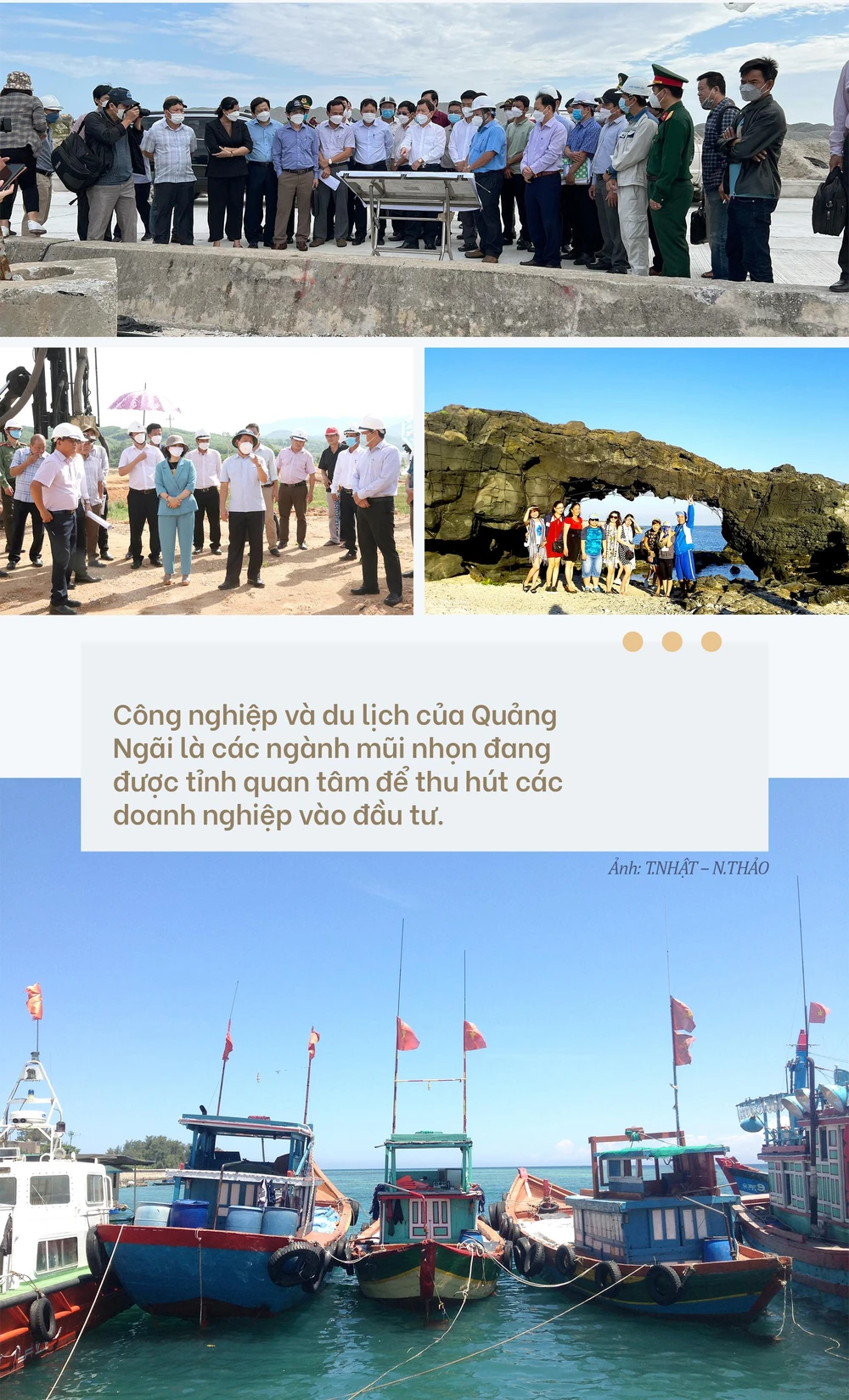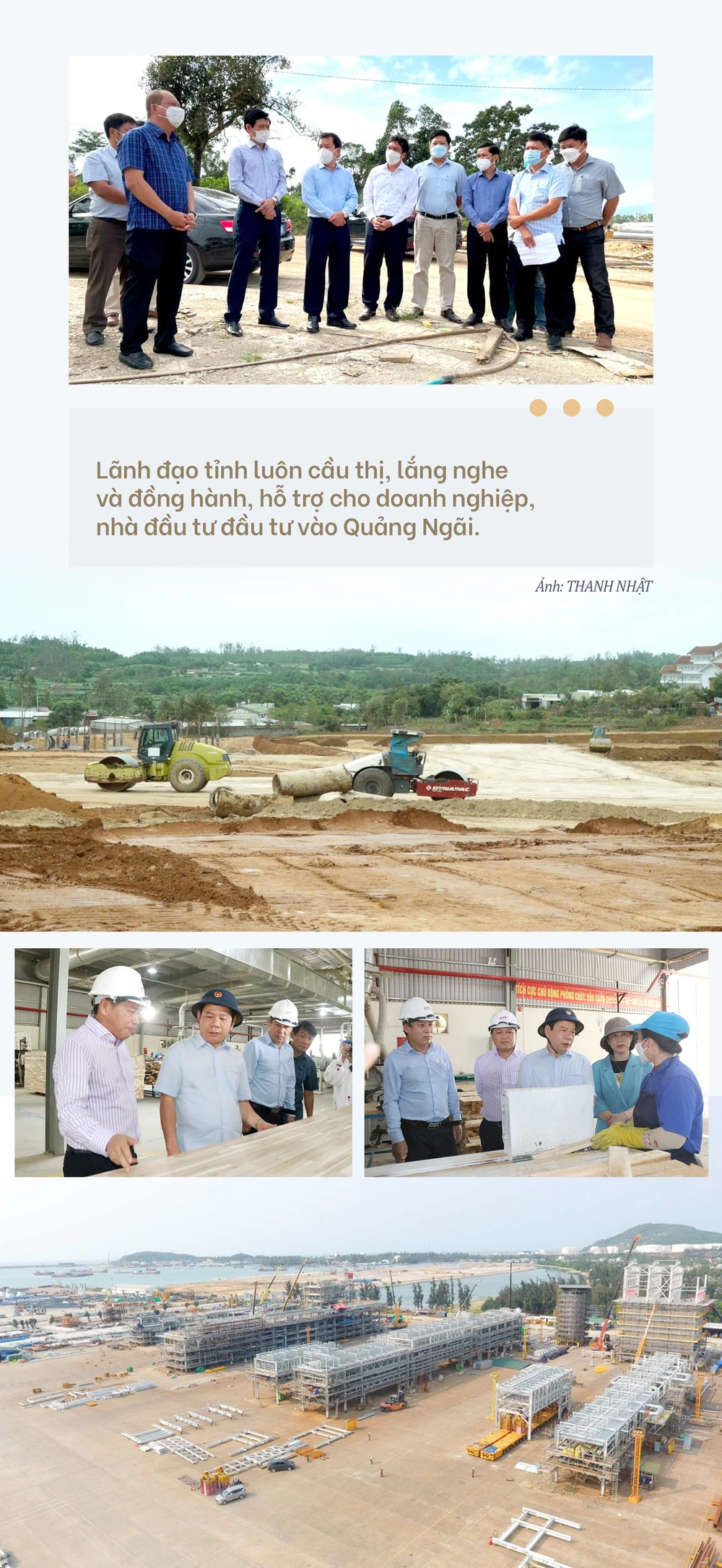 + Quảng Ngãi đã tổ chức nhiều buổi gặp mặt các doanh nghiệp, nhà đầu tư để lắng nghe và tháo gỡ những khó khăn, vướng mắc trong quá trình hoạt động tại tỉnh. Quan điểm xuyên suốt của lãnh đạo tỉnh là luôn cầu thị, lắng nghe, đồng hành, hỗ trợ cho doanh nghiệp, nhà đầu tư; đồng thời chia sẻ những định hướng phát triển của tỉnh đến cộng đồng các doanh nghiệp, nhà đầu tư.