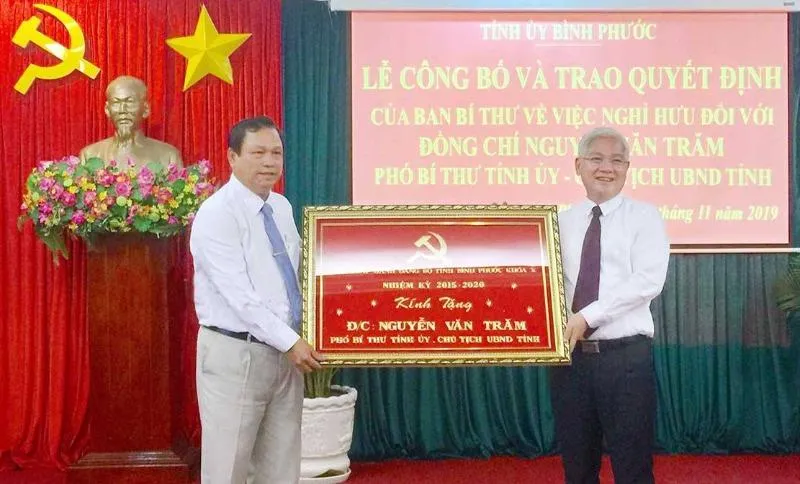Ngày 29-11, Tỉnh ủy Bình Phước đã tổ chức lễ công bố và trao quyết định của Ban Bí thư về việc nghỉ hưu đối với ông Nguyễn Văn Trăm, Phó Bí thư Tỉnh ủy, Chủ tịch UBND tỉnh. Ông Trăm sẽ chính thức nghỉ hưu theo chế độ từ ngày 1-12-2019.