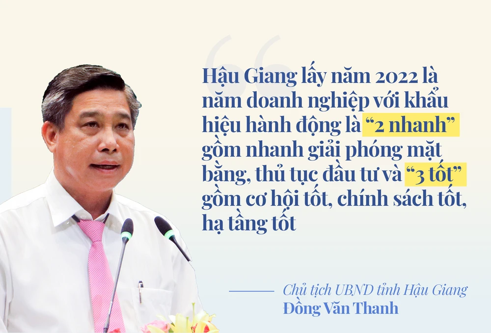 Với khẩu hiệu hành động “hai nhanh” là nhanh giải phóng mặt bằng và thủ tục đầu tư và “ba tốt” là cơ hội tốt, chính sách tốt, hạ tầng tốt, Hậu Giang lấy năm 2022 là Năm doanh nghiệp tỉnh với quan điểm “Doanh nghiệp đến, Hậu Giang vui”. Hậu Giang dự kiến tổ chức Hội nghị xúc tiến đầu tư trong quý II-2022.