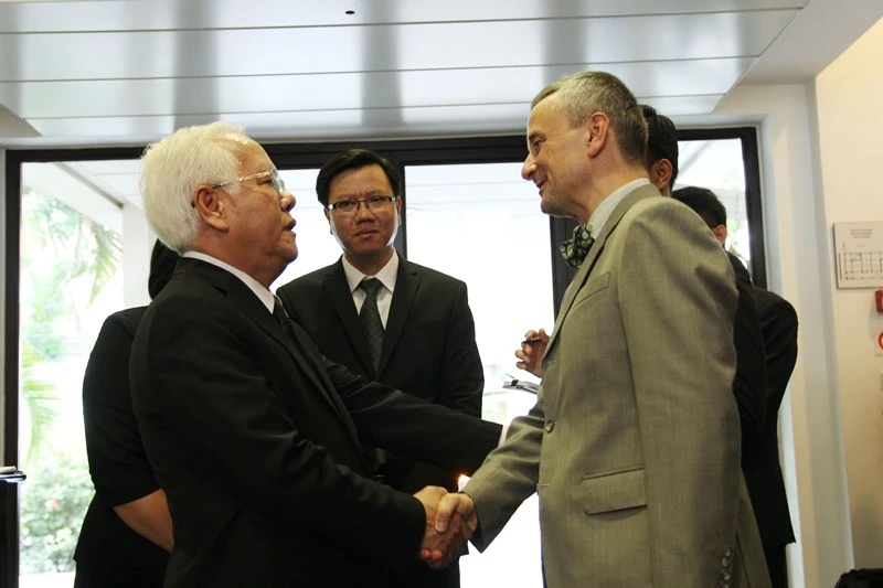 Tổng lãnh sự Pháp tại TP.HCM Emmanuel Ly-Batallan (bìa trái) trả lời phỏng vấn báo chí chiều 16-11. Ảnh: HOÀNG GIANG