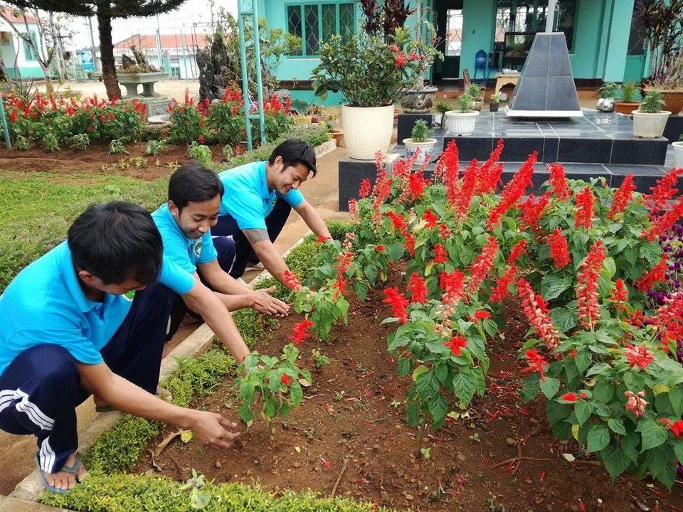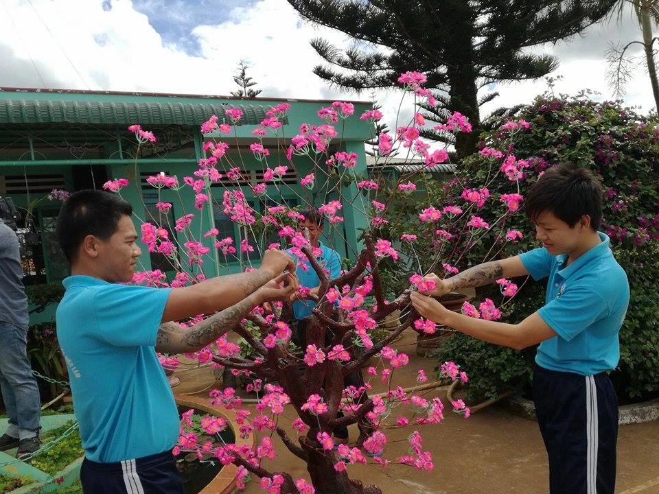 Học viên cai nghiện đang trang trí cây cảnh chuẩn bị đón tết