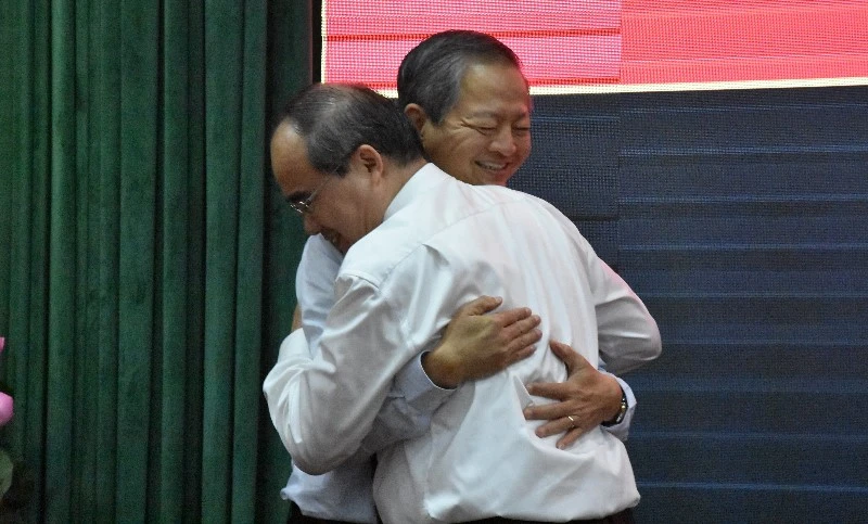 Bí thư Thành ủy Nguyễn Thiện Nhân ôm chia tay ông Khoa. Ảnh: TÁ LÂM