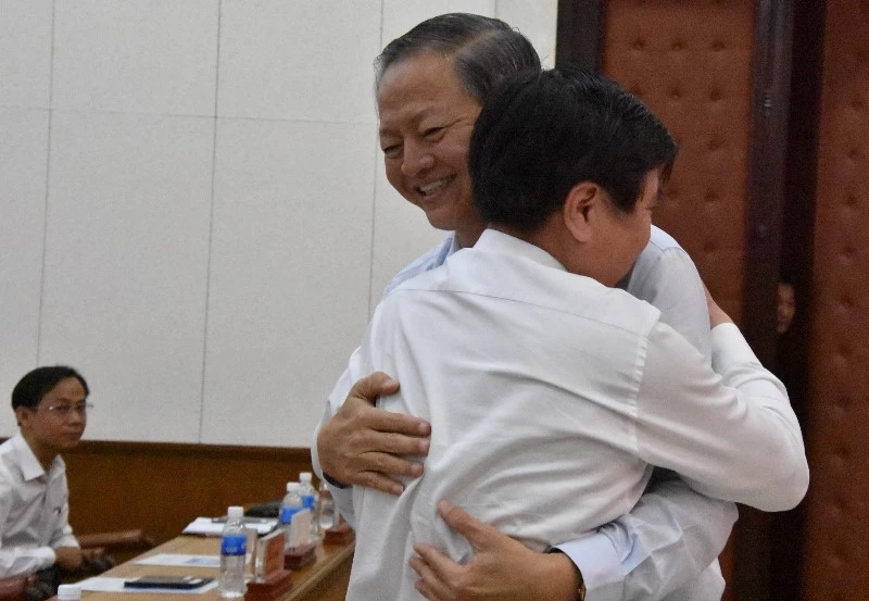 Ông Nguyễn Thành Phong ôm chia tay ông Khoa. Ảnh: TÁ LÂM