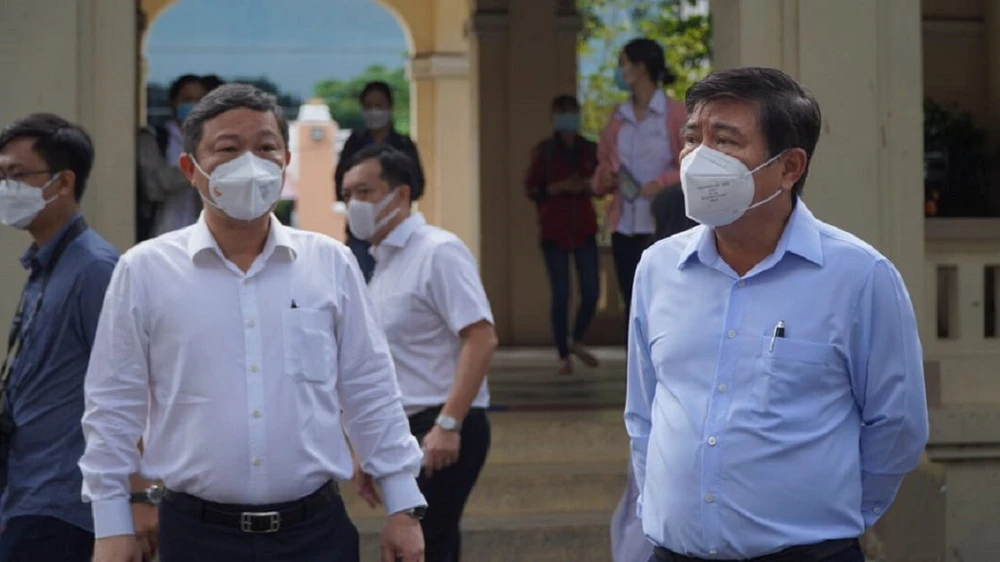 Chủ tịch UBND TP Nguyễn Thành Phong (bìa phải) và Phó Chủ tịch UBND TP Dương Anh Đức đang kiểm tra công tác tổ chức kỳ thi tốt nghiệp. Ảnh: NT