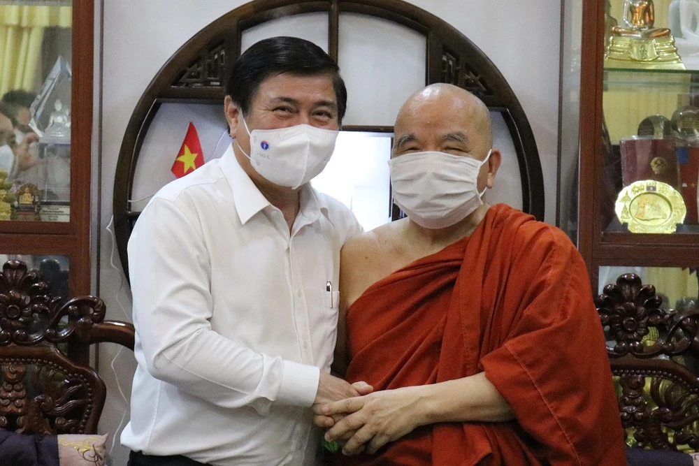 Phó Bí thư Thành ủy Nguyễn Thành Phong thăm Hòa thượng Thích Thiện Pháp, Phó Chủ tịch Thường trực Hội đồng trị sự Giáo hội Phật giáo Việt Nam, Trưởng ban Tăng sự Trung ương Giáo hội Phật giáo Việt Nam. Ảnh: KHÁNH CHI