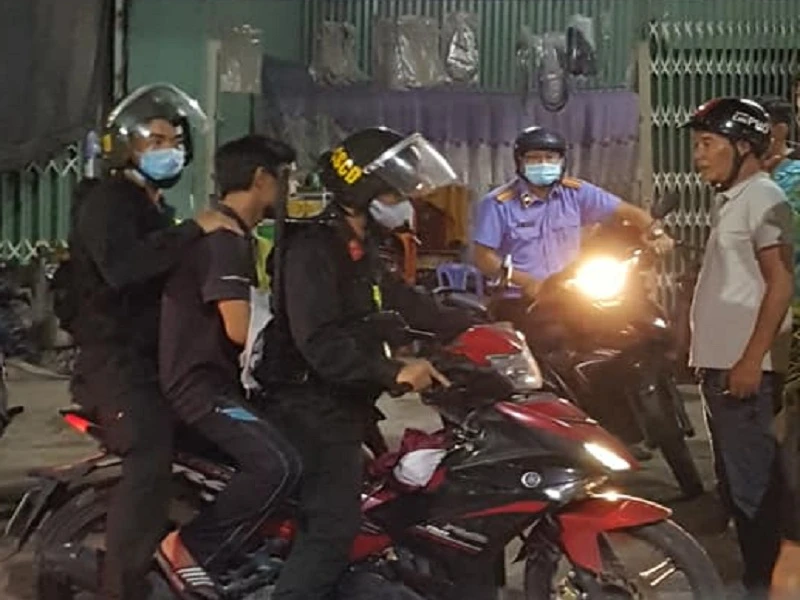 Nghi can áo (áo đen ngồi giữa xe máy) bị bắt khẩn cấp. Ảnh: VH.
