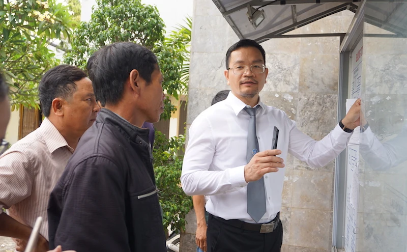 LS Nguyễn Thành Công cho biết tòa không lên lịch xét xử công khai vụ án. Đến khi hỏi thì cán bộ văn phòng mới chạy tới dán lịch nhưng lại không có dấu và chữ ký. Ảnh: NGÂN NGA