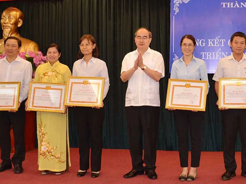 Bí thư Thành ủy TP.HCM Nguyễn Thiện Nhân trao bằng khen cho các đơn vị. Ảnh: SĨ HẢI