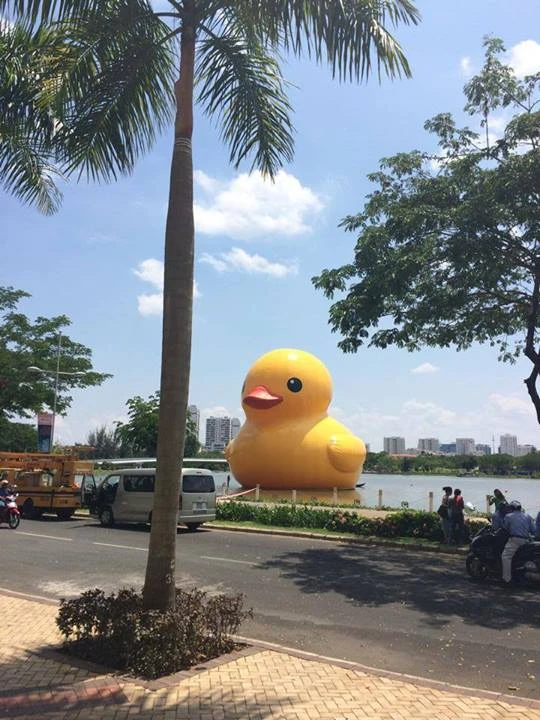 Hôm nay, sau nhiều ngày chờ đợi, cuối cùng chú vịt cũng đã chính thức cập bến Việt Nam khi xuất hiện ở Hồ Bán Nguyệt, Q7, TP.HCM. Được biết, các kỹ thuật viên mất một tháng để tạo ra chú vịt khổng lồ với kích thước 25m x 18m x 18m đặt trên một cầu phao được chế tạo riêng rộng 15m.