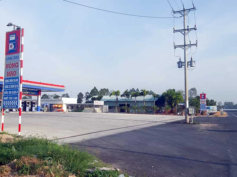 Cây xăng Hồng Hào ngang nhiên mọc trên phần đất đường dẫn cầu Vàm Cống. Ảnh: CHÂU ANH
