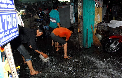Tất bật tát nước tràn vào nhà sau một cơn mưa ở TP.HCM. Ảnh: HTD