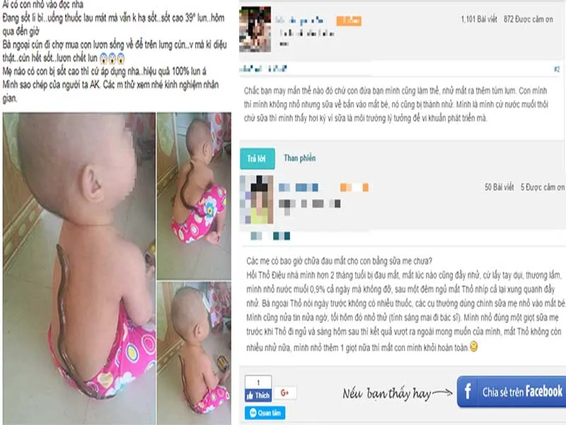 Phương pháp chữa sốt bằng lươn (trái) cho bé được một mẹ bỉm sữa chia sẻ và phương pháp chữa đau mắt bằng sữa mẹ (phải) được truyền tai, hậu quả là một phụ huynh làm theo khiến mắt bé bị nặng hơn. Ảnh: ITN