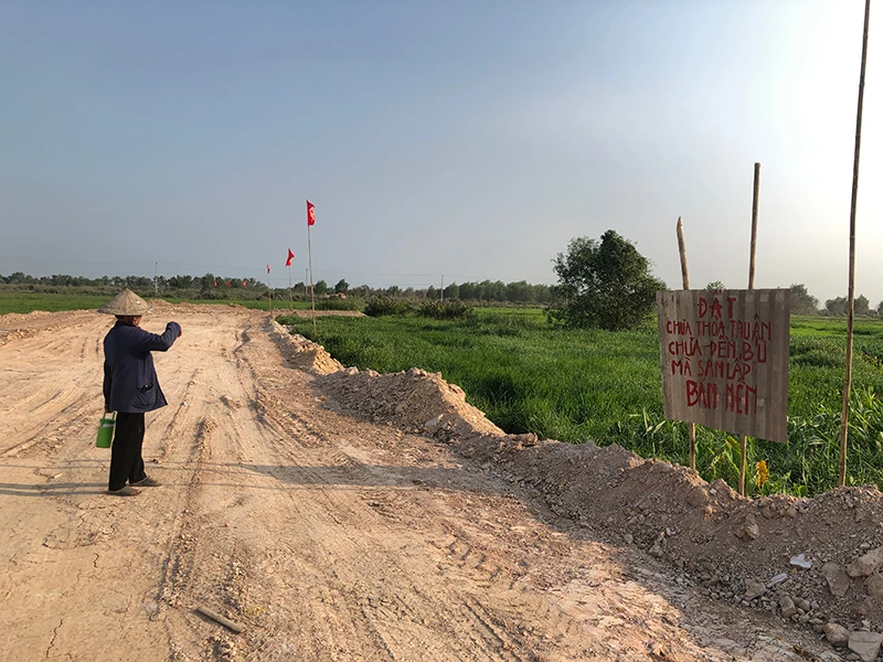 Chung cảnh ngộ, ông V. cho biết cuối năm 2019, việc san ủi đất chưa bồi thường chỉ diễn ra trên quy mô nhỏ. Tuy nhiên, trong tháng 3 và 4-2020, lợi dụng cách ly xã hội người dân ít ra trông coi đất, chủ đầu tư đã san lấp lấn sang nhiều diện tích đất của ông và nhiều người dân. “Để giữ đất của mình, chúng tôi sáng vác các cọc ra cắm ở những ranh đất bị san lấp, chiều ra nhổ để thu cọc về. Vì nếu để lại thì chỉ qua một đêm, tất cả cọc, bảng hiệu đều biến mất” - ông V. nói.