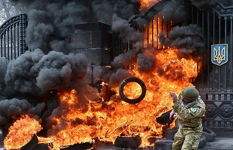 Ngày 2-2, các binh sĩ tiểu đoàn Aydar đốt vỏ xe trước cổng Bộ Quốc phòng ở Kiev. Tiểu đoàn này bị điều tra vì các hành vi man rợ trong chiến tranh. Ảnh: GETTY IMAGES