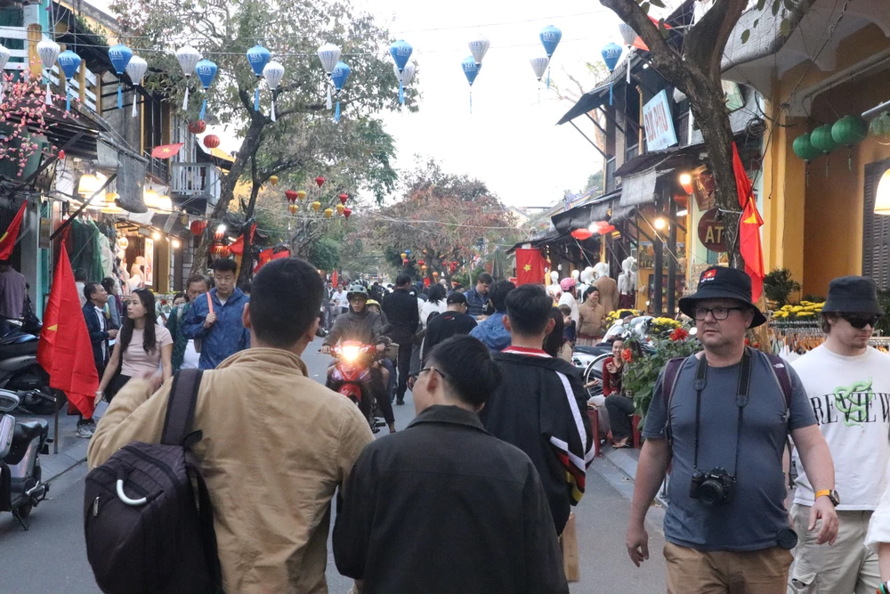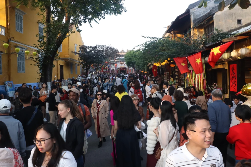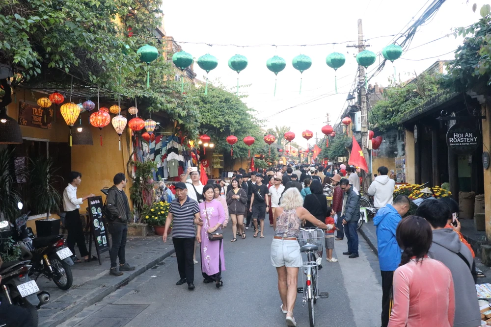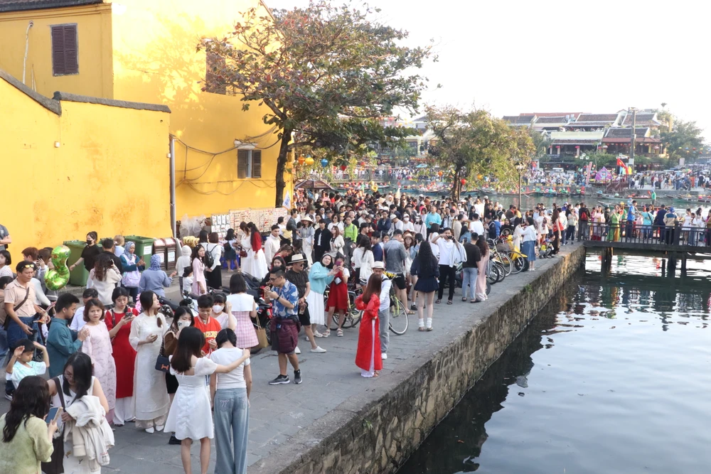 Những ngày đầu năm hàng ngàn người dân và du khách đổ về Hội An để tham quan và chụp ảnh, tạo nên không khí nhộn nhịp và đông vui như trẩy hội. Chùa Cầu Hội An về đêm vẫn chật kín khách du lịch. Du khách phủ kín những tuyến đường tại phố cổ Hội An. Từ sáng mùng 2 Tết, các tuyến đường chính của Hội An như Bạch Đằng, Lê Lợi, Hoàng Văn Thụ, Trần Phú… đã đông nghịt người dân và du khách. Hình ảnh Hội An nhìn từ Chùa Cầu. Nhiều mặt hàng lưu niệm, thủ công mỹ nghệ, vải lụa và các mặt hàng truyền thống do chính người dân Hội An làm và bày bán cũng thu hút nhiều du khách dừng lại xem, mua về làm quà. Các món hàng lưu niệm được bày bán dịp đầu năm mới