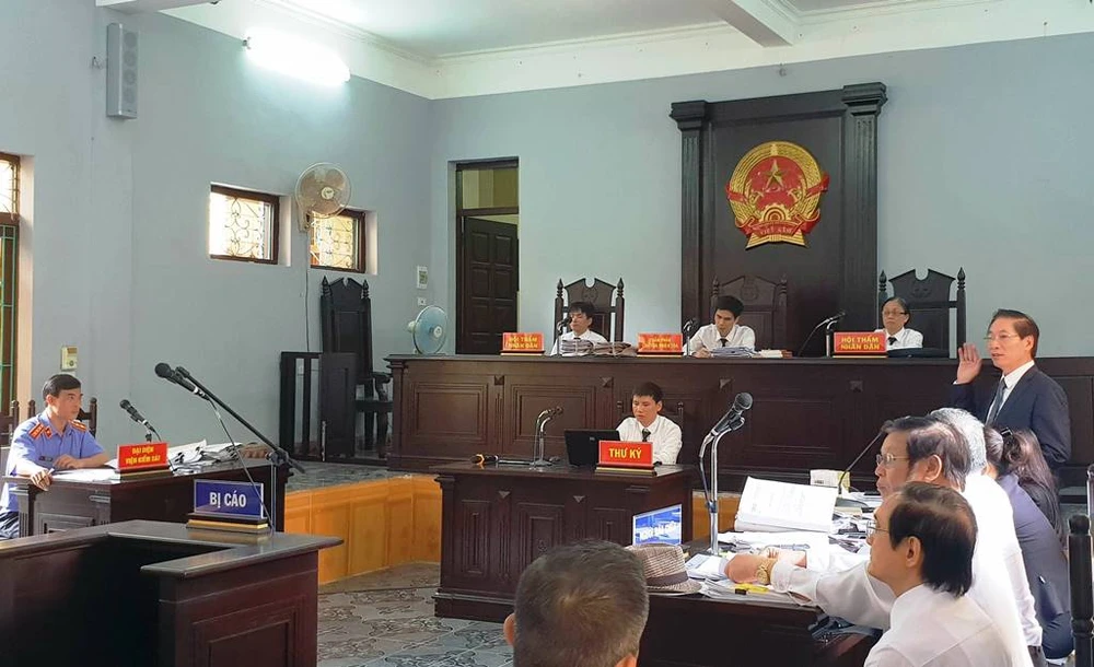 Luật sư Chiến (đứng, bìa phải) đang trình bày quan điểm bào chữa. Theo luật sư Chiến, VKSND tỉnh Hưng Yên không điều tra lại theo yêu cầu của HĐXX ngày 31-1 là không tuân thủ trình tự tố tụng. Ảnh: CHÂN LUẬN