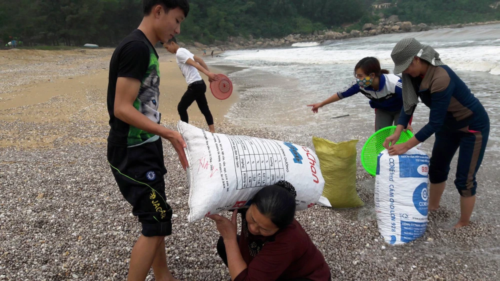 Thời gian gần đây, mỗi khi sóng to, biển động, sò lông bị cuốn dạt vào bờ biển xã Thạch Hải. Người dân mang dụng cụ ra bờ biển vớt “lộc trời” mang về dùng và bán cho các nhà hàng và thương lái.