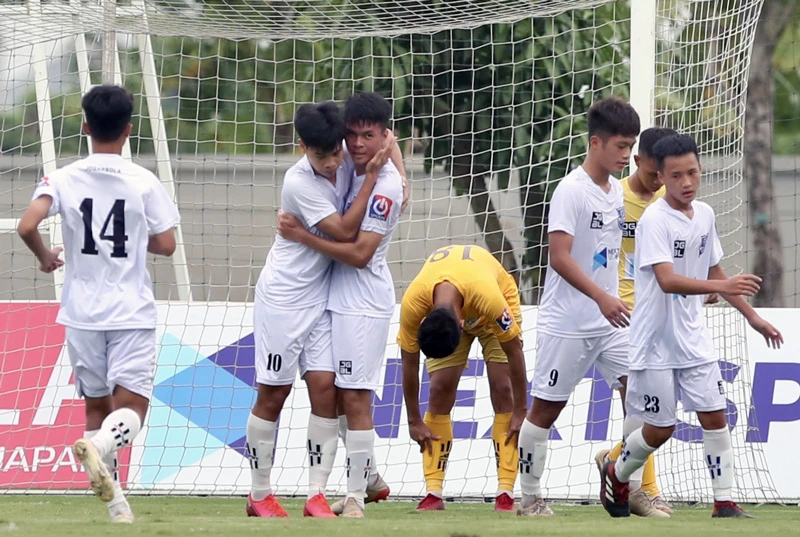 ... thì cầu thủ Nutifood đánh bại Học viện HA Gia Lai JMG 3-0. Ảnh: AN.