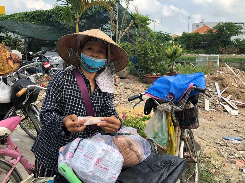 Cô Báu trải lòng, quê mình mãi tận Thái Nguyên, ly hương vào Sài Gòn tám năm nay làm đủ thứ nghề để mưu sinh. Ba năm nay sức khỏe xuống nhanh nên cô xoay sang bán vé số, dọc đường tiện thì lượm ve chai để cải thiện thu nhập.