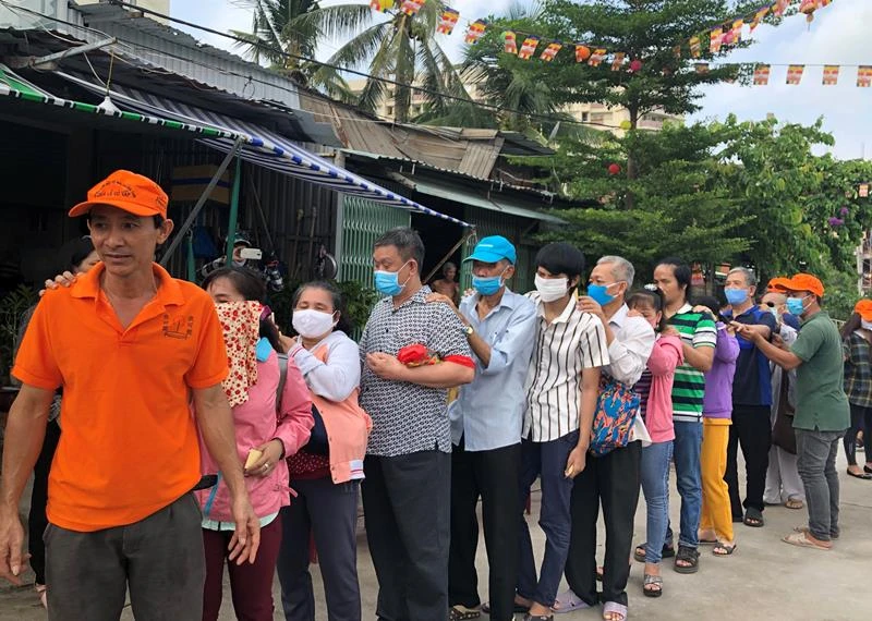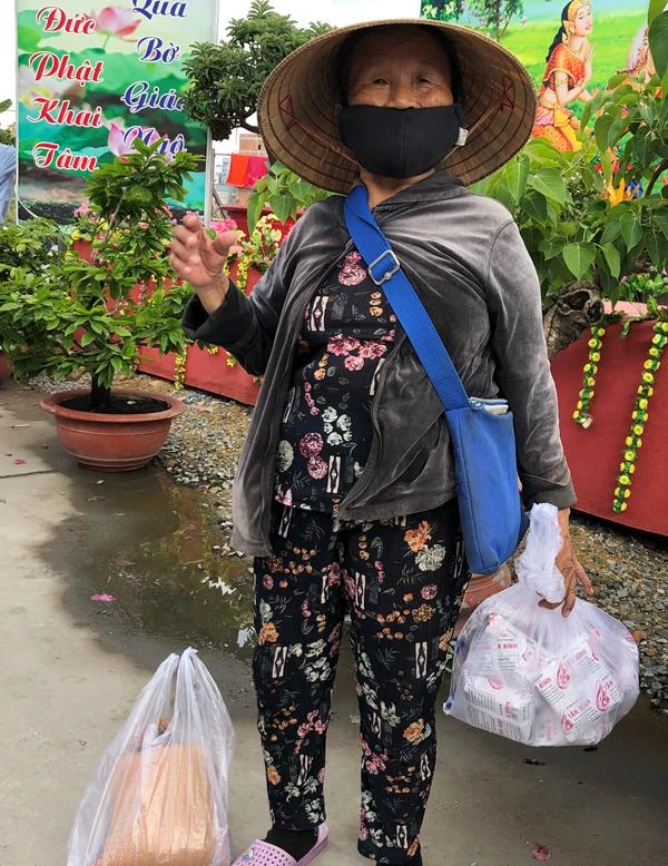 Trong dòng người đến nhận những phần quà của chùa Lá, tôi cũng trò chuyện với cô Tạ Thị Nguyên cùng làm nghề bán vé số. Cô nói hiện đang trú tại quận Gò Vấp. Cơn đại dịch kéo dài khiến công việc của những người bán số dạo như mình bị gián đoạn một thời gian, nguồn mưu sinh vì thế cũng bị ngưng trệ, bữa ăn bấp bênh.