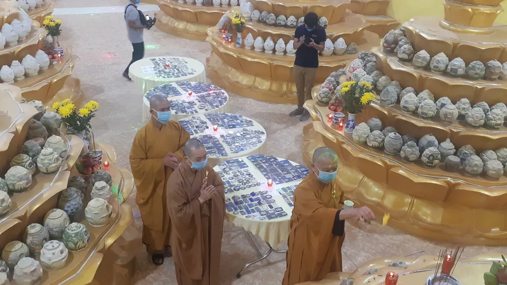 Nghi lễ sái tịnh được tiến hành tại nơi để các hũ tro cốt ở chùa Kỳ Quang 2: ảnh: NGUYỄN HIỀN