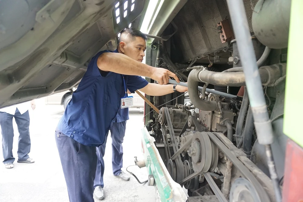 và kiểm tra máy móc phần sau của xe buýt có đạt yêu cầu hay không.