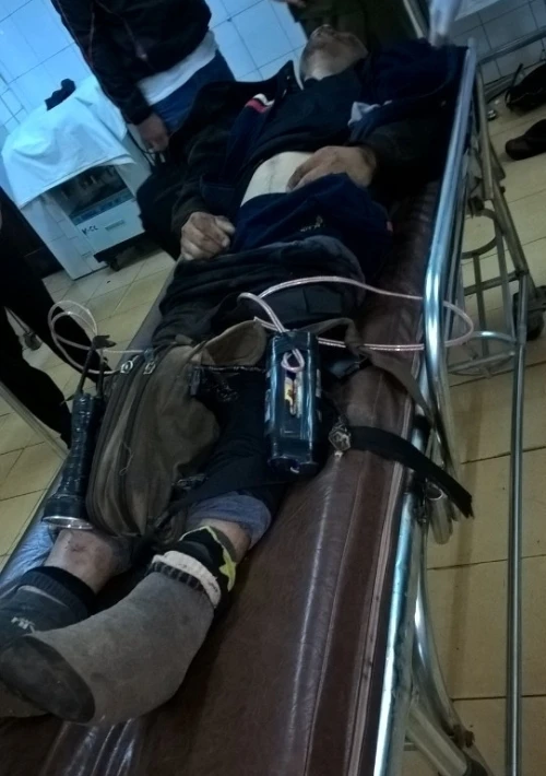 Nạn nhân bị thương khi đưa đi cấp cứu vẫn còn đeo đụng cụ trộm chó trên người. (Ảnh do người dân cung cấp)