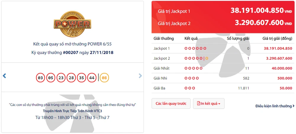 Tại kỳ quay số mở thưởng (QSMT) thứ 207 sản phẩm xổ số tự chọn Power 6/55 ngày 27-11-2018, Công ty Xổ số điện toán Việt Nam (Vietlott) xác định có một vé trúng thưởng Jackpot 2 trị giá 3,29 tỉ đồng (chưa khấu trừ thuế thu nhập cá nhân theo quy định nhà nước) được phát hành tại Quảng Ngãi.