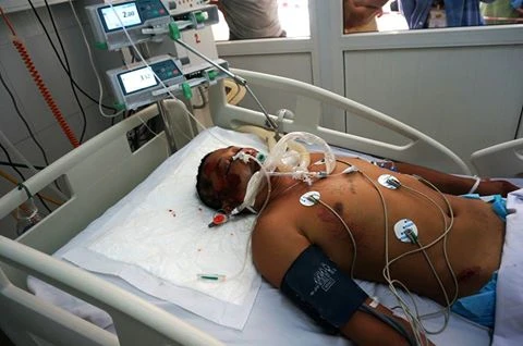 Nạn nhân đang nằm cấp cứu tại khoa Hồi sức Ngoại khoa, BV Hữu nghị Đa khoa Nghệ An.