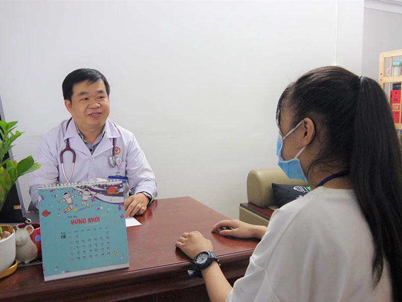 BS Tạ Vương Khoa đang tìm hiểu và tư vấn tâm lý cho một người bệnh trẻ. Ảnh: AC