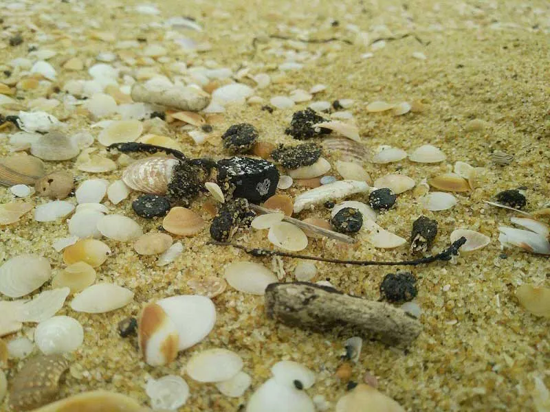Dầu vón cục dạt vào bãi biển Quảng Nam. Ảnh: HUY TRƯỜNG