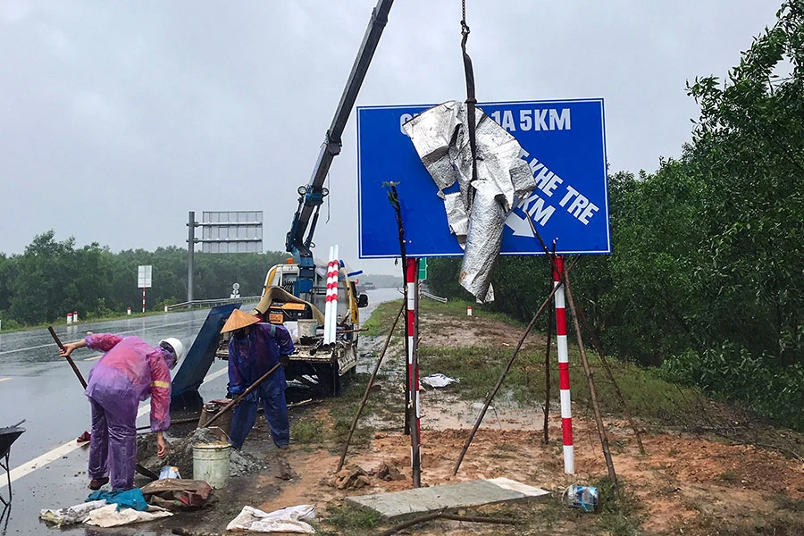 Các đơn vị thi công đang vệ sinh các biển báo giao thông. Ảnh: ND
