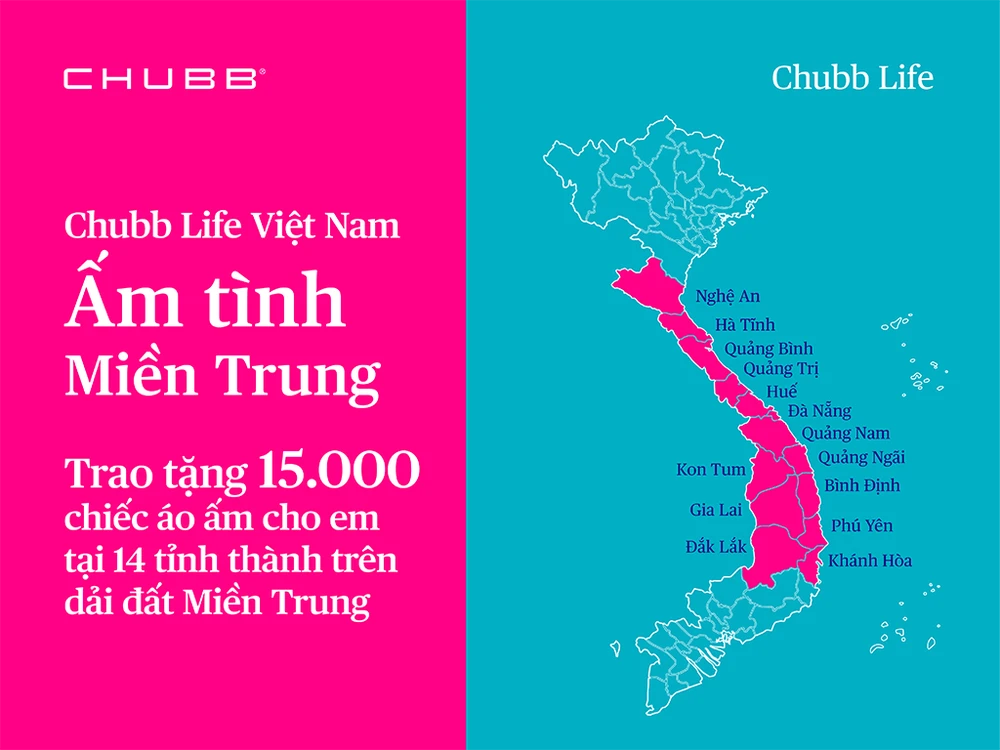 Trong đó, có 15.000 chiếc áo ấm tinh tươm trong chương trình “Chubb Life Việt Nam - Ấm tình miền Trung” đã được chuyển đến 14 tỉnh/thành: Nghệ An, Hà Tĩnh, Quảng Bình, Quảng Trị, Thừa Thiên Huế, Đà Nẵng, Quảng Nam, Quảng Ngãi, Bình Định, Phú Yên, Khánh Hòa, Kon Tum, Gia Lai, Đắk Lắk.