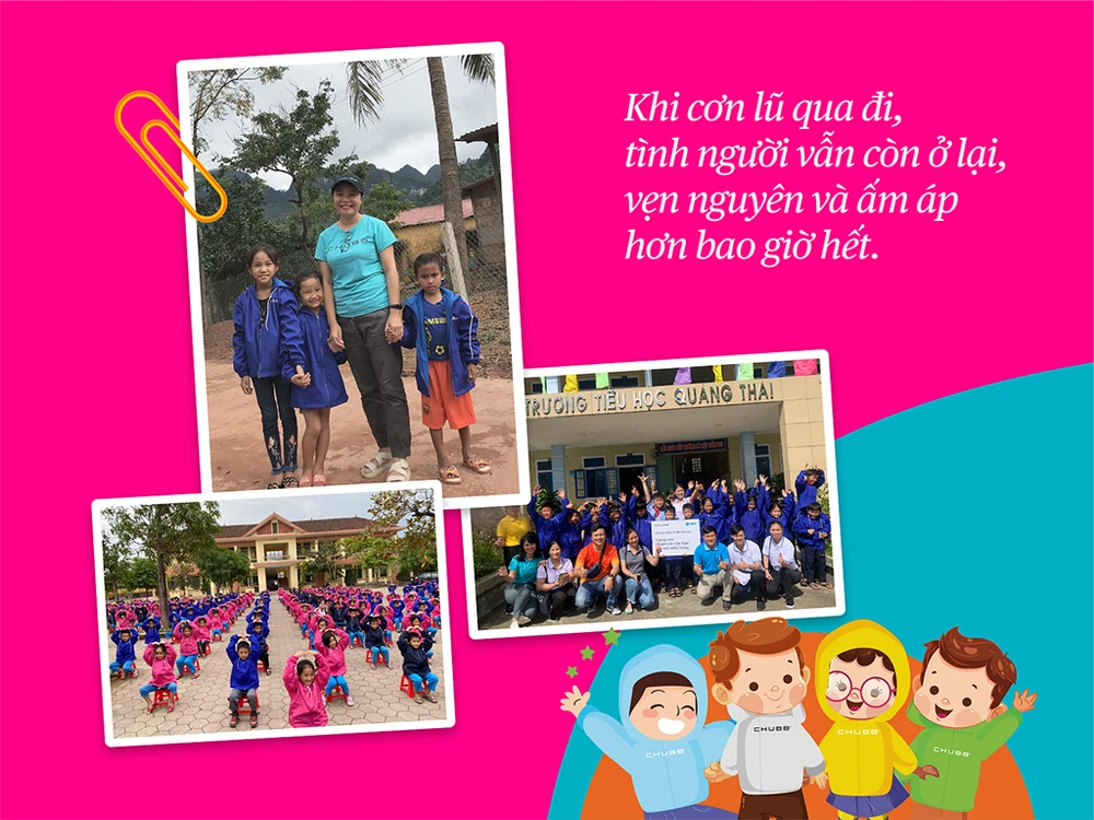 Cùng với tinh thần đó, tất cả các thành viên Chubb Life Việt Nam mong muốn mang đến cho các em học sinh ở 14 tỉnh/thành bị thiệt hại nặng nề trong đợt bão vừa qua những nụ cười rạng rỡ, giúp xoa dịu những mất mát sau tàn phá của thiên nhiên.
