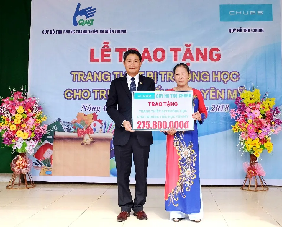 Cụ thể, thông qua Quỹ hỗ trợ phòng tránh thiên tai miền Trung, Quỹ Thiện nguyện Chubb phối hợp cùng Chubb Life Việt Nam trao tặng máy tính, trang bị thư viện, phòng học tiếng Anh, hệ thống lọc nước sạch và các giáo cụ dạy học với tổng giá trị tài trợ gần 1,5 tỉ đồng cho bảy ngôi trường. Trong số đó có năm trường tiểu học đã được Chubb Life Việt Nam và Quỹ Thiện nguyện Chubb tài trợ xây mới trước đây, gồm: Trường Tiểu học Số 1 Triệu Độ (Quảng Trị); Trường Tiểu học Số 2 Quảng Thành (Thừa Thiên-Huế); Trường Tiểu học Số 2 Vĩnh Thành (Nghệ An); Trường Tiểu học Yên Mỹ (Thanh Hóa); Trường Tiểu học Cát Chánh (Bình Định); Trường Mầm non Vạn Khánh (Khánh Hòa) và Trường Mầm non Vạn Hưng (Khánh Hòa).