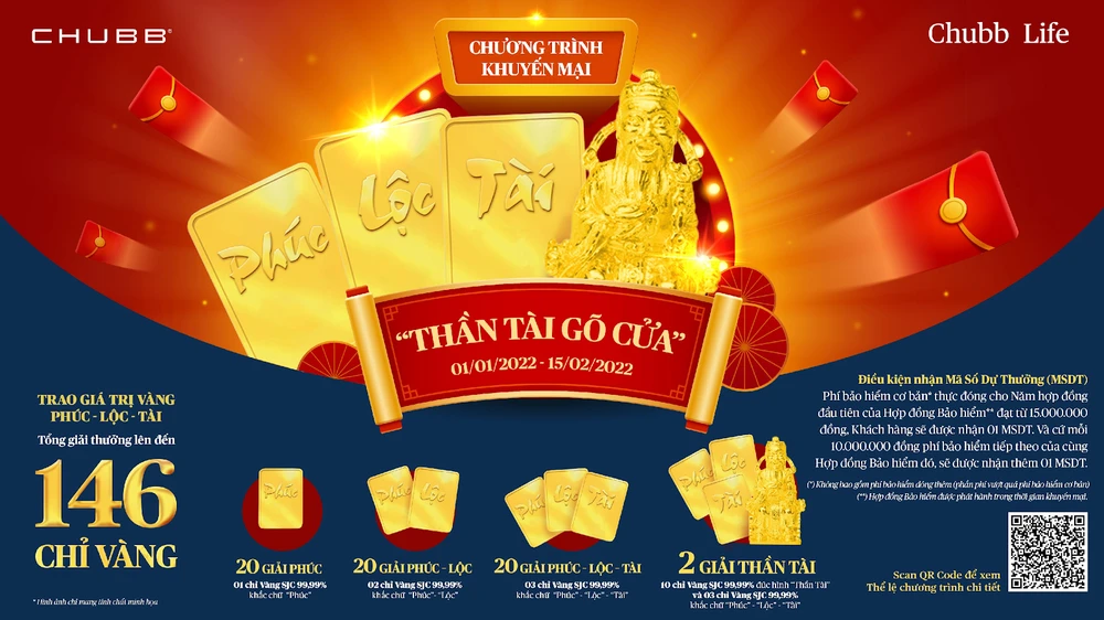 Cụ thể, từ ngày 01-01 đến hết ngày 15-02, Chubb Life Việt Nam triển khai chương trình khuyến mại “Thần tài gõ cửa” với tổng giá trị giải thưởng lên đến 146 chỉ vàng SJC 99,99% nhằm gửi tới khách hàng lời chúc cho một năm mới hạnh phúc sum vầy, đầy tài lộc.